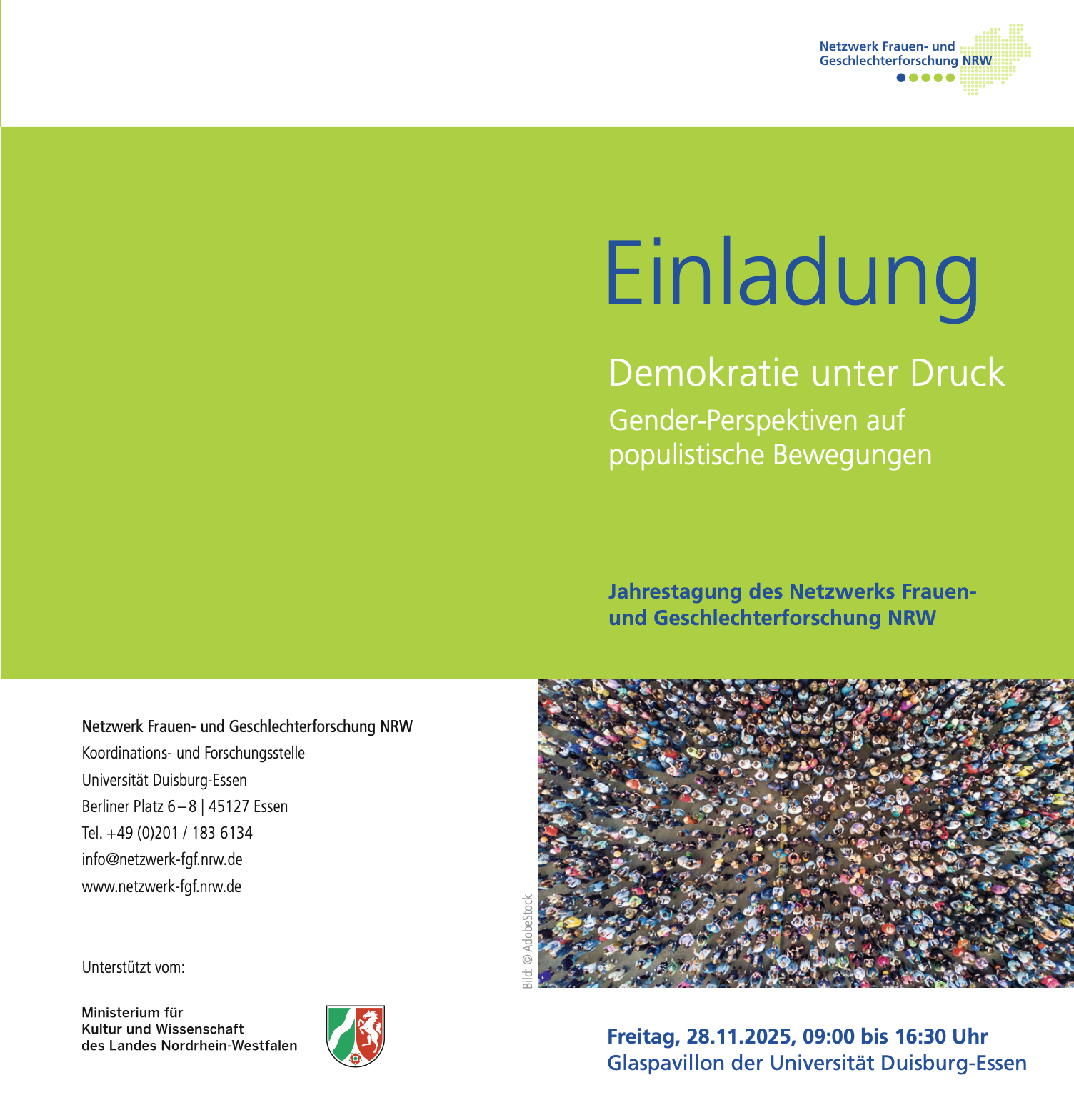 28.11.2025, 15 Uhr Moderation des Key Note-Vortrags von Prof. Dr. Evelyn Annuß auf der Jahrestagung des Netzwerks Frauen- und Geschlechterforschung NRW an der Universität Duisburg-Essen zum Thema Demokratie unter Druck. Gender-Perspektiven auf populistische Bewegungen.